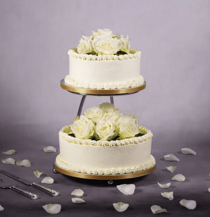 Elegante pastel de boda de dos niveles con glaseado texturizado en blanco y adornado con rosas blancas frescas en la parte superior y entre las capas.